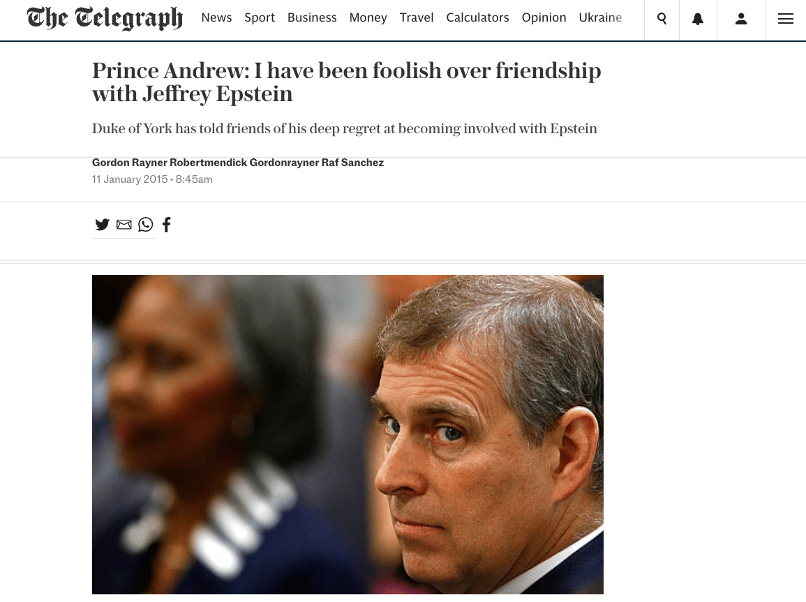 Then, on Jan. 11, 2015, a story appeared in the Telegraph reporting that Andrew said he had been “foolish” to befriend and maintain a relationship with Epstein. It’s important to note that, according to the Telegraph, unlike the two previous statements, this wasn’t an official quote from the Palace — the Telegraph said that it got the quotes from “a source close to the Duke.” As often happens in the UK press, the story was immediately picked up by several outlets such as the Daily Mail, the Times, and the Daily Beast, to name a few.