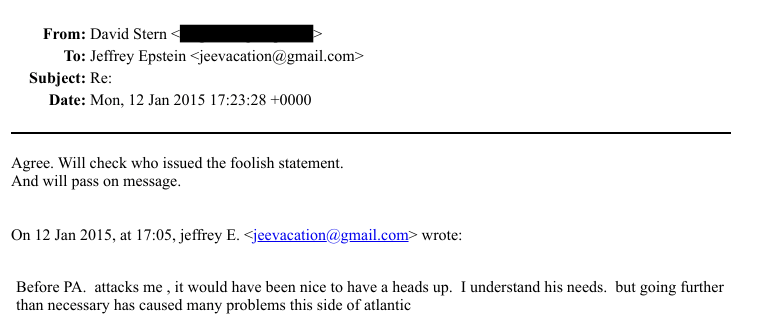 The other key detail in these emails concerns Stern’s true role in Andrew’s office. The exchange between Epstein and Stern implies that he’s much more than a director of the Pitch @ Palace initiative. Despite his job title, he’s apparently going to go talk to Andrew’s media team in order to find the person who talked to the Telegraph — he’s seemingly high enough in the hierarchy to be able to chastise the press officers who said something that Epstein didn’t like.