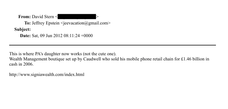 So who is Stern? The Sun and the Guardian describe Stern as a “businessman.” Thanks to official records, we know that he was a director at Andrew’s now-defunct “Pitch @ Palace” initiative, which, according to the royal family’s official website, was “an initiative set up by [Andrew] to guide, help and connect entrepreneurs with potential supporters, in order to accelerate and amplify their businesses.” Fun fact: the initiative wasn’t founded until 2014! Thanks to the emails, however, we know that Epstein introduced Stern to Sarah (and Andrew, by proxy) in early 2010.